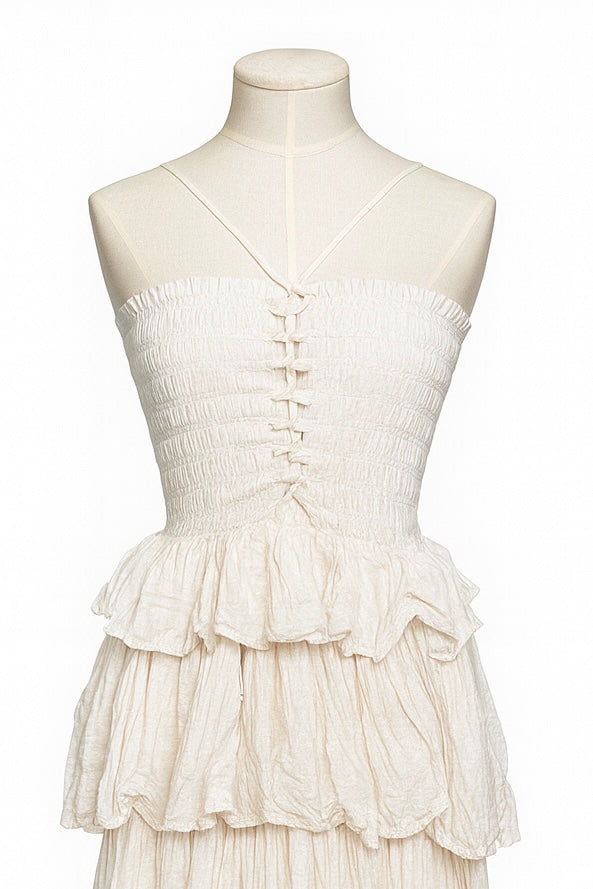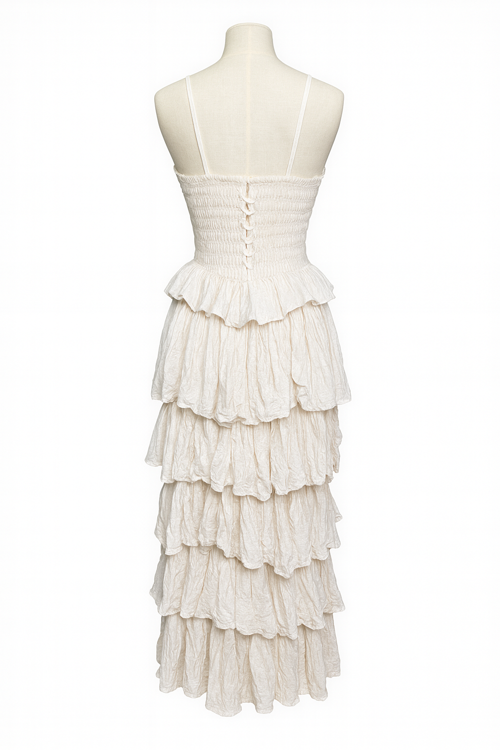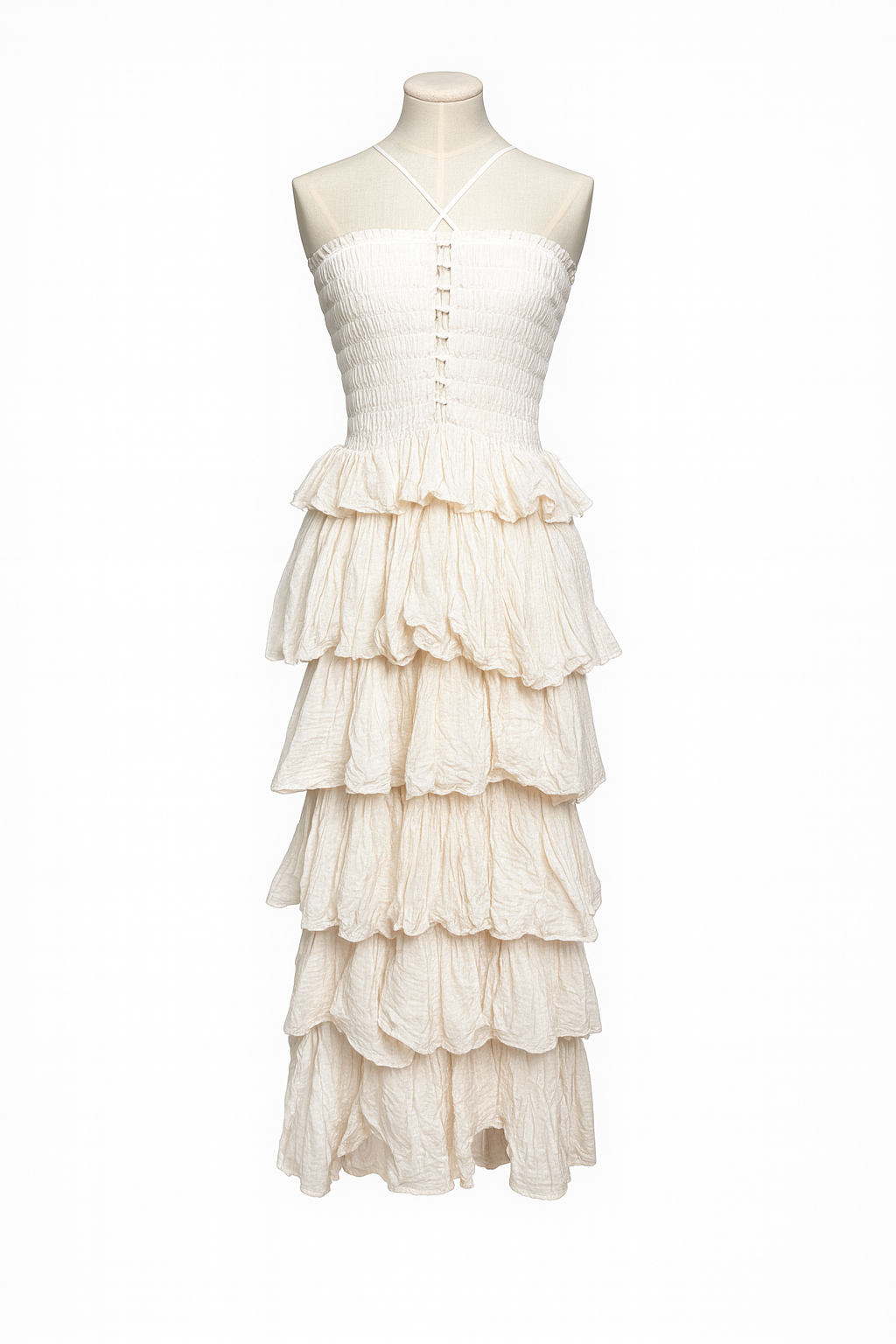 This versatile one-size-fits-all dress is designed for comfort and adaptability, featuring stretchy elastic waistbands that gently conform to different body shapes. Adjustable ties add extra flexibility, allowing the wearer to customise the look and feel, whether cinched for a defined silhouette or left on looser for relaxed wear.